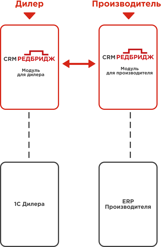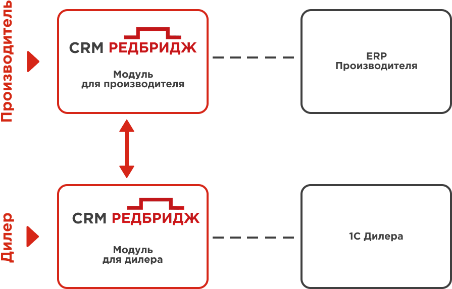 РЕДБРИДЖ интегрируется с ERP и CRM производителя через API, обеспечивая обмен данными о дилерах и участии в сделках. Данные синхронизируются через общие справочники товаров, клиентов и техники, позволяя каждому дилеру использовать собственные каталоги, согласованные с центральным сервером производителя.